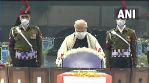 વડા પ્રધાન નરેન્દ્ર મોદી અને સંરક્ષણ પ્રધાન રાજનાથ સિંહે આજે રાત્રે લગભગ 9 વાગ્યે પાલમ એરપોર્ટ પર CDS જનરલ બિપિન રાવત અને અન્ય સશસ્ત્ર દળોના જવાનોને શ્રદ્ધાંજલિ આપી હતી. CDS રાવત સહિત સેનાના અન્ય જવાનોના પાર્થિવ દેહ દિલ્